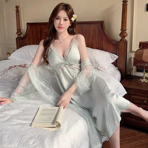 Butterfly Lace Long Satin Chiffon Loungewear Set with Built-in Cups - Sexy V-Neck SleepwearItem NO.: GUY_191