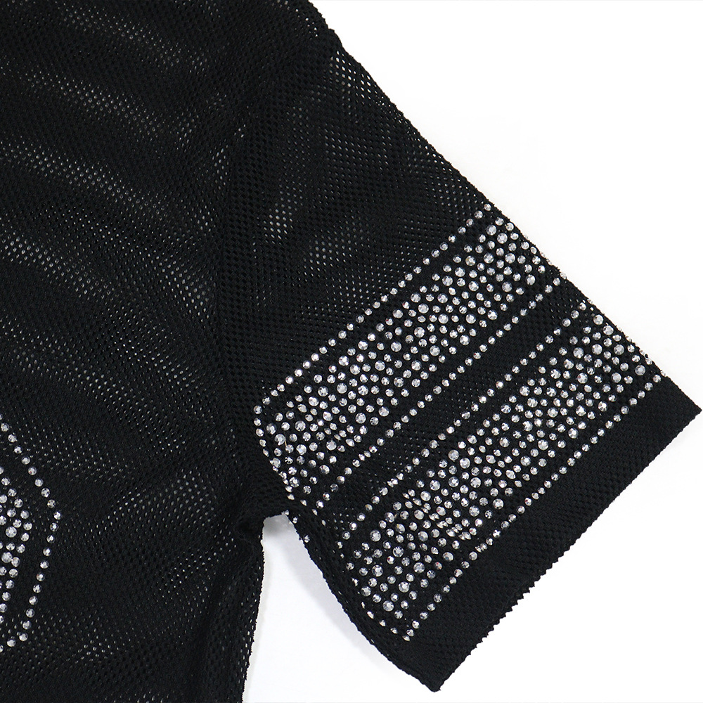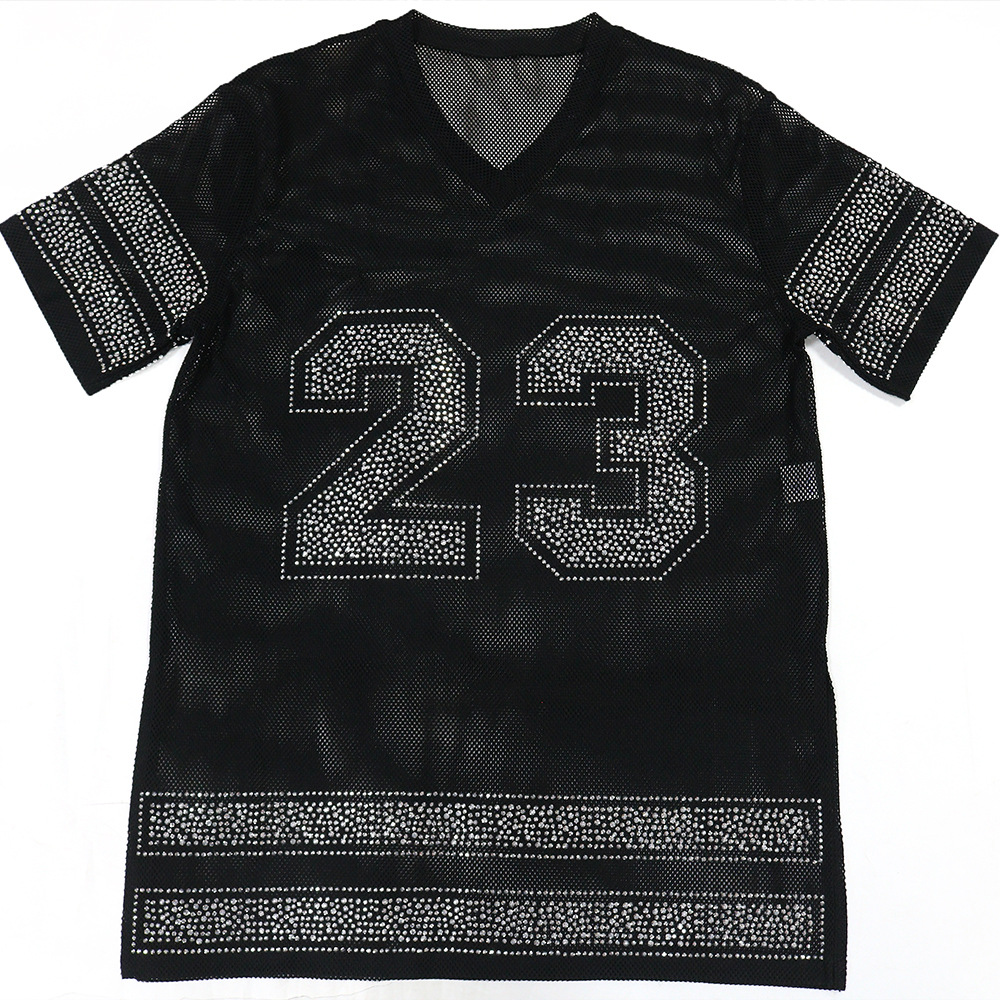 jersey number 23 hot stamping rhinestone pattern Long Mesh Sheer v Neck Long T-Shirt